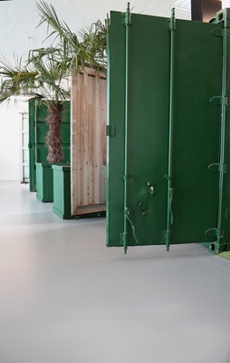 Vanwege de behoefte aan een open ruimte maar ook aan besloten overlegplekken zijn er oude groene zeecontainers binnengebracht. Deze zijn centraal in de hal geplaatst en hebben de functie als vergaderruimte en concentratiewerkplekken. Voor de akoestiek is gewerkt met tegels van oude autobanden.