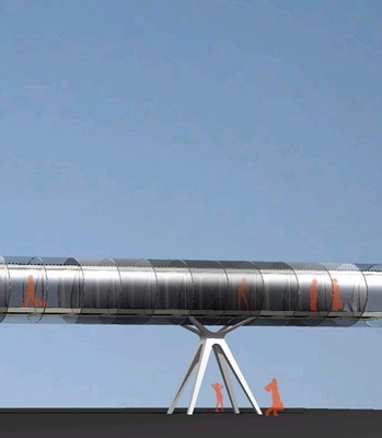 Tom David Architecten zegt te hebben gekozen voor ‘een esthetiek die past bij het rauwe karakter van de Rotterdamse haven’. “De basis van de brug bestaat uit een beproefde staalconstructie, met poten die refereren aan havenkranen, en een buisvormige schil van transparant zeildoek”, zeggen de architecten.