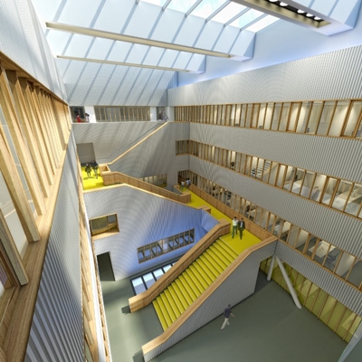 Boven een deel van de grote overdekte W-hal en het gebouw voor centrale studentenvoorzieningen komt een gebouw van vijf verdiepingen.