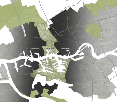 Winnaar ‘Door Dicht en Dun’ stelt voor om de leefkwaliteit van Rotterdam te vergroten door een strategische keuze te maken voor verdunning van in onbruik geraakte en rakende haven- en industriegebieden. Zo ‘krijgt de stad weer lucht’ en kunnen bestaande woonomgevingen op een duurzame manier worden verdicht.