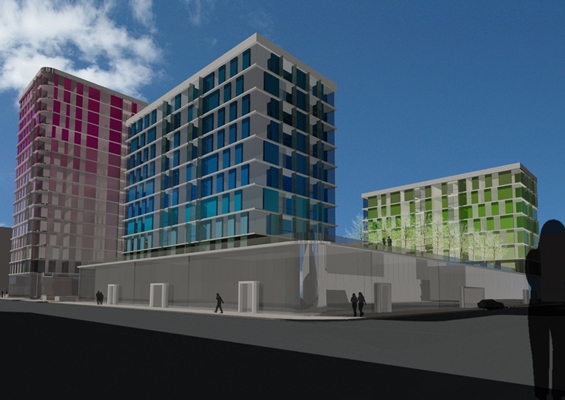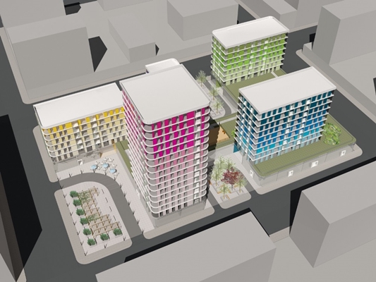 Kayhan en De Vries proberen met hun ontwerp een brug te slaan tussen menselijke schaal en de schaal van de stad. “Op een dubbelhoge plint die door zijn programma en detaillering aansluit bij de beleving van de stad staan vijf individuele gekleurde woontorens. Hun kleuren zijn een verwijzing naar het kleurgebruik uit de Russische architectuurtraditie”, vertellen de twee.