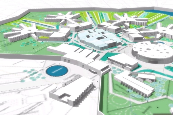 Binnen de bebouwing is op subtiele wijze variatie aangebracht. Zo heeft het centrale gebouw een kristalachtig voorkomen en is het bekleed met metalen platen in groentinten, daar waar de gevangenis als geheel wit en grijs oogt. Het culturele centrum is weer ondergebracht in een rond gebouw. In het landschap zijn voorzieningen als een atletiekbaan en een vijver geïntegreerd.