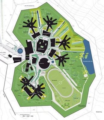 Het geheel bevindt zich wel binnen een muur, maar door diens stervormige opstelling zal deze volgens de architecten minder ‘aanwezig’ zijn dan die rond een regulier gevangeniscomplex. Binnen de muur bevindt zich een compact stedelijk blok, die wordt omgeven door een natuurlijk landschap dat als meer dan een luchtplaats kan worden beschouwd.