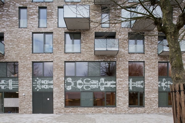De aanwezigheid van een school is op subtiele wijze verduidelijkt in de gevel, die in samenwerking met kunstenares