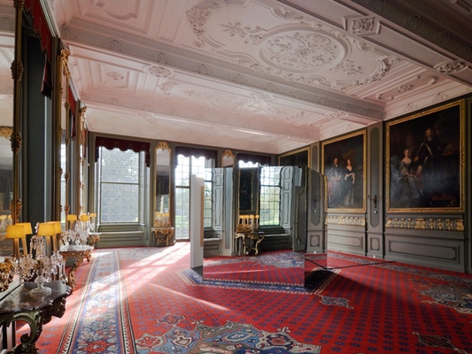, gaf het 'paviljoen' een hexagonale vorm. Deze is afgeleid van het centrale motief in het kamerbrede vloerkleed. De buitenzijde is bekleed met spiegelende acrylaatplaten. Door de spiegeling wordt het interieur van de barokke ruimte nog overdadiger waarbij paviljoen, balzaal, bezoeker en portretten visueel samensmelten in één gelaagd beeld.
