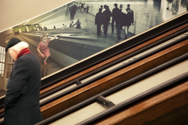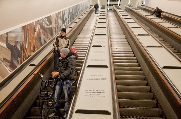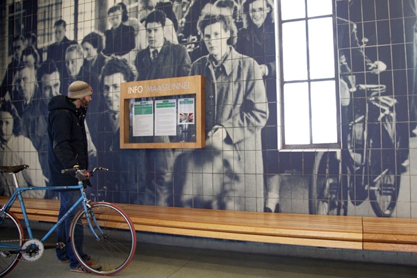 Op de roltrap van de zuidelijke ingang tot de Maastunnel op het Charloisse Hoofd gaat een fotocollage in op de geschiedenis van het project. De bouw van de tunnel was voor die tijd een technisch hoogstandje. De tunnelstukken werden eerst in een speciaal dok in de Heysehaven gebouwd, afgebouwd aan een steiger van het werkterrein in de Waalhaven en later versleept en afgezonken in de tunnelgeul.