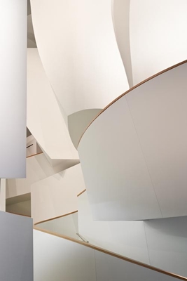 De karakteristieke stijl van Gehry is vooral in het interieur te herkennen, zoals in de sculpturale vormen in de entreehal en concerthal. Het wit van de gevel is doorgevoerd in de binnenwand- en plafondbekleding.