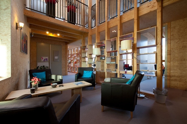 Binnen is gezocht naar warmte; figuurlijk door veel hout te gebruiken en letterlijk dankzij isolatie en een eigen energiezuinige klimaatinstallatie. Ook contrast vormt een leidraad voor het interieur, zoals die tussen hoge vides en knusse hoeken. “Open wanden van houten kolommen zorgen afwisselend voor afscherming of juist voor subtiele doorzichten”, zegt EGM.