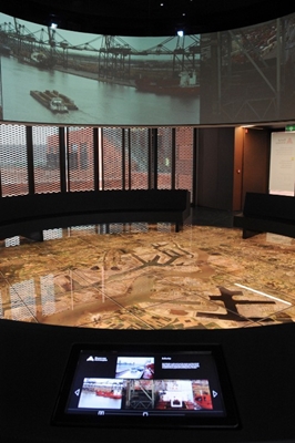 . Terwijl om hem heen van alles gebeurt, hoort hij tegelijkertijd havengeluiden. Interactieve informatieschermen ondersteunen de projectie, door bijvoorbeeld nader uit te leggen wat er te zien is op de beelden.