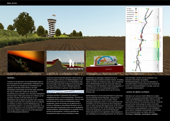 Een fietspad met landmark, luwtescherm, led-verlichting, en website. Het plan ‘Via Vici’ van Mooredesign won de ideeënprijsvraag voor de fietsroute RijnWaalpad. De jury prees vooral het totale karakter van het plan dat “mensen verleidt tussen Arnhem en Nijmegen de fiets te pakken.”