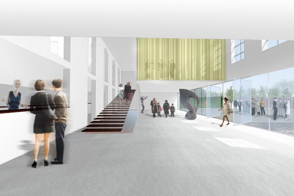 Het verlaagde maaiveld wordt ingericht als entreeplein, in de woorden van NEXT en Uytenhaak een ‘eigentijdse agora’. "Daarmee behoudt het gemeentehuis haar formele ceremoniële entree terwijl het nieuwe plein een laagdrempelige toegang biedt voor het alledaagse gebruik", aldus de bureaus.