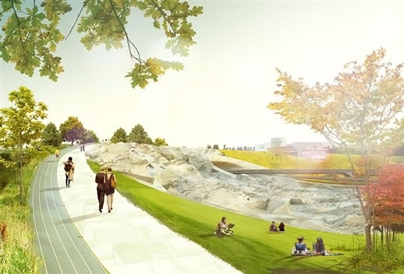 In de huidige situatie wordt het landschap in vier gebieden verdeeld door de verschillende wegen. In het ontwerp van BIG worden deze gebieden verbonden door circulaire fiets- en wandelroutes, omkaderd door openbare gebouwen, zoals winkel- en sportcentra, een hammam en een moskee.