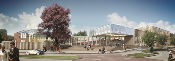 Begin deze maand is het hoogste punt bereikt van ‘De Nieuwe Kolk’ in Assen. Het bijna 50.000 vierkante meter grote gebouw bevat een bibliotheek, theater, bioscoop, centrum beeldende kunst, woningen, commerciële ruimte, horeca en parkeerruimte. Het ontwerp is van