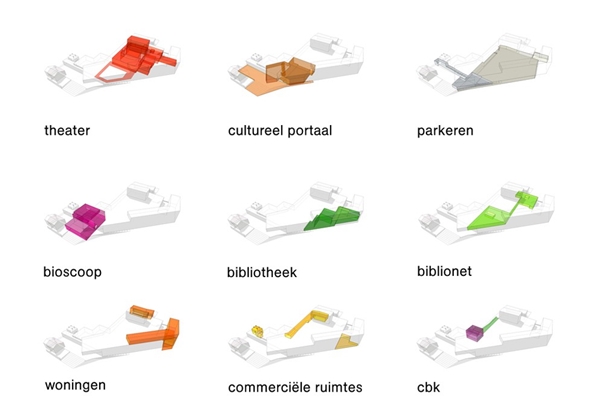 Een hoge open, transparante en lichte hal waarin het theater, de bioscoop, het centrum beeldende kunst met beeldentuin en de bibliotheek allen een eigen plek hebben en samen een levendig beeld opleveren. Centraal hierin ligt het grand café dat voor iedereen goed bereikbaar is.