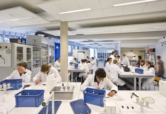 Het gebouw opent zich met verdiepingshoge ramen naar het omringende groen en biedt leerlingen en docenten een stimulerende leeromgeving met veel daglicht. Door de transparante gevel zijn alle lesactiviteiten ook van buiten goed zichtbaar. Het onderwijs is niet verstopt, maar doelbewust in de ‘etalage’ gezet, zegt RAU.