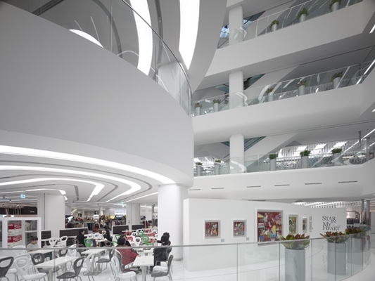 geopend. Als entree voor een nieuw ontwikkeld gebied vormt ‘place branding’ een belangrijke functie van het complex. Daartoe zijn zowel buiten als binnen optische illusies gecreëerd.
