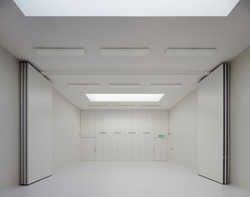 De gevel rond de activiteitenzaal op de eerste verdieping is volledig gesloten. “Hierdoor wordt een geluidsdichte, hermetische en introverte ruimte gevormd. De neutrale verschijningsvorm wordt gerelativeerd door de royale vrije hoogte en de twee grote daklichten welke de ruimte aangenaam natuurlijk verlichten”, vervolgt het bureau.