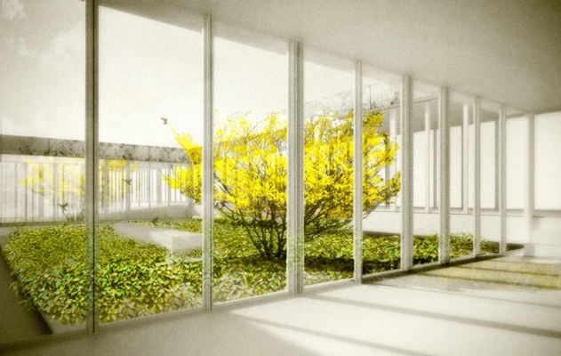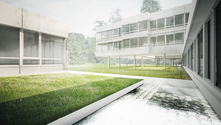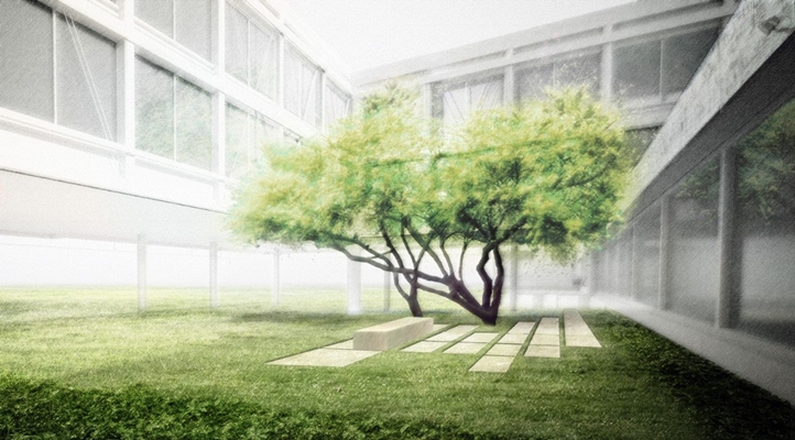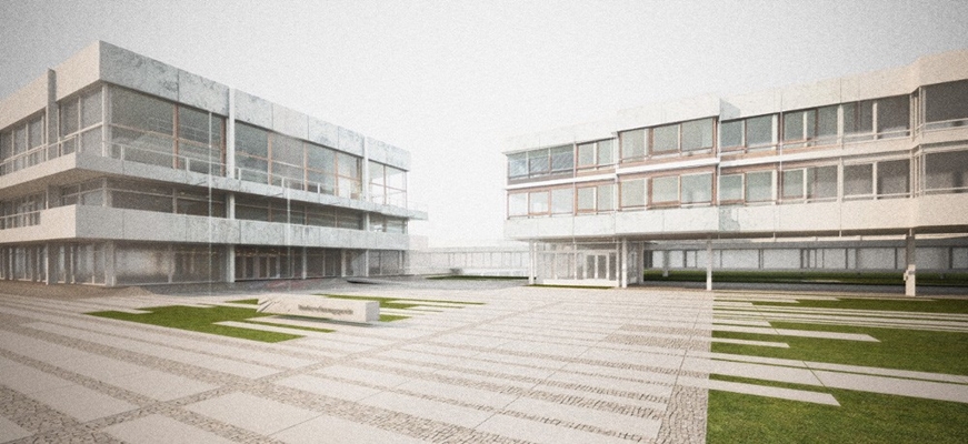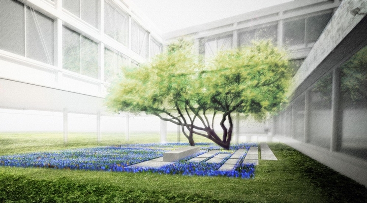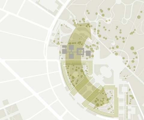 “Het campusontwerp gaat uit van een grasland waarin gestileerde betonnen banen een patroon maken waarin de gebouwen zweven. Het ontwerp kenmerkt zich door zijn ingetogenheid en optimale integratie van de monumentale gebouwen in de omgeving”, zegt West 8.
