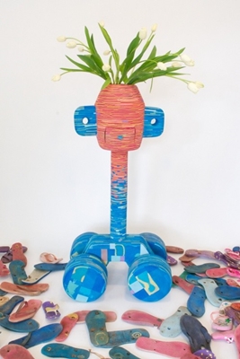 De objecten in ‘A Flip Flop Story’ zijn opgebouwd uit vele blokjes in vale kleuren, gesneden uit tal van teenslippers. Schneemann laat op een ludieke manier zien hoe oude materialen kunnen worden hergebruikt.