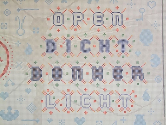 Het ‘borduurwerk’ verbeeldt de gemeenschap van Houten. Aan de rand van het kunstwerk vormen de beginletters A tot Z woorden die de gemeente Houten typeren. Een geschreven rijm in het midden van de gevel verwijst naar het Fladderfestival in Houten.