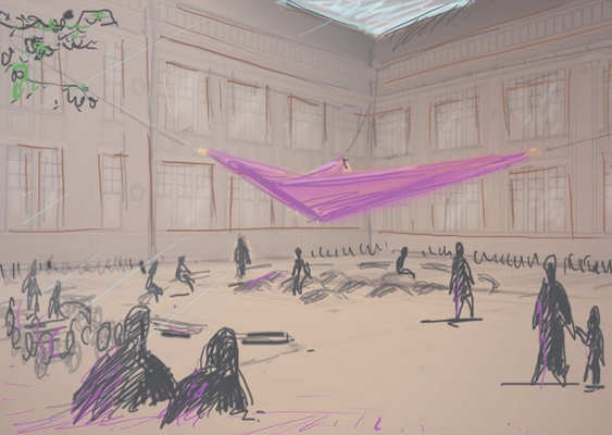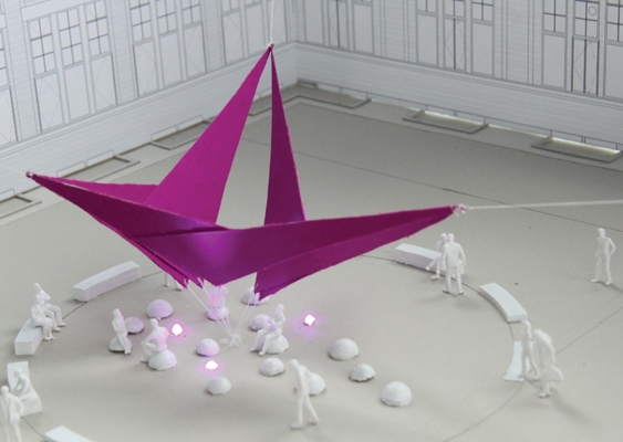 Stylos over de Act of Folly: “Dit ontwerp streeft ernaar een herkenbare ruimte te creëren die fungeert als icoon met grote aantrekkingskracht. Middels het ontwerp is geprobeerd om de sfeer en identiteit die nu binnen de faculteit heerst ook naar buiten te brengen. Dit heeft geleid tot een fris en dynamisch sculpturaal object dat slechts is opgebouwd uit enkele doeken en staalkabels.”