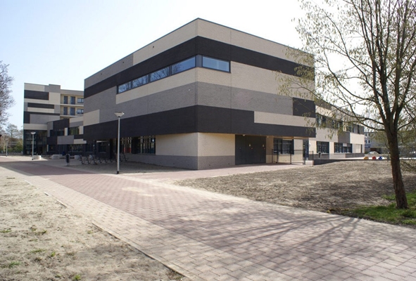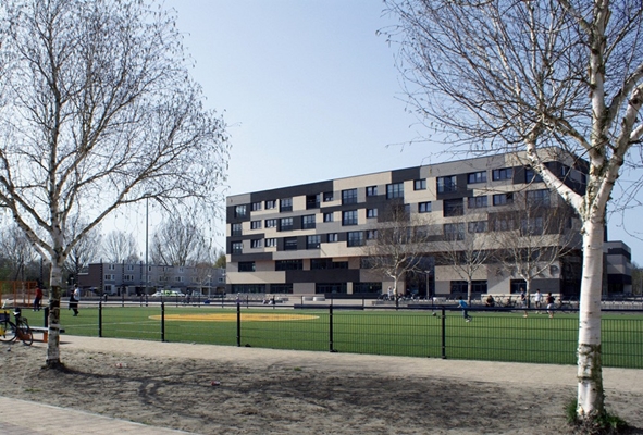 Het complex bevat in de basis twee verdiepingen. Aan de kop zijn er drie lagen met appartementen bovenop gebouwd en ook de achtergelegen sporthal is hoger. De woningen vormen een soort luifel, doordat de hoofdentree eronder terug ligt.