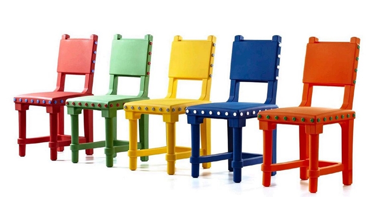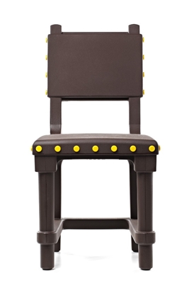 Een opvallend detail zijn de plastic noppen die zijn geplaatst op de rand van de stoel. Deze noppen zijn kenmerkend voor de neogotische stoelen en werden vroeger gebruikt om de bekleding van de stoelen op hun plaats te houden. De stoel is beschikbaar in verschillende, felle kleurstellingen die het kunstmatig karakter van de stoel extra benadrukken.