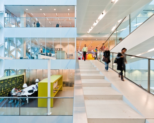 “Er is veel levendigheid in het gebouw en met name in de centrale ruimte. Dat hoort ook bij een dynamische opleiding als journalistiek”, zegt Pim Pompen, een van de drie projectarchitecten. Ook de faculteit Economie is in het gebouw gevestigd.