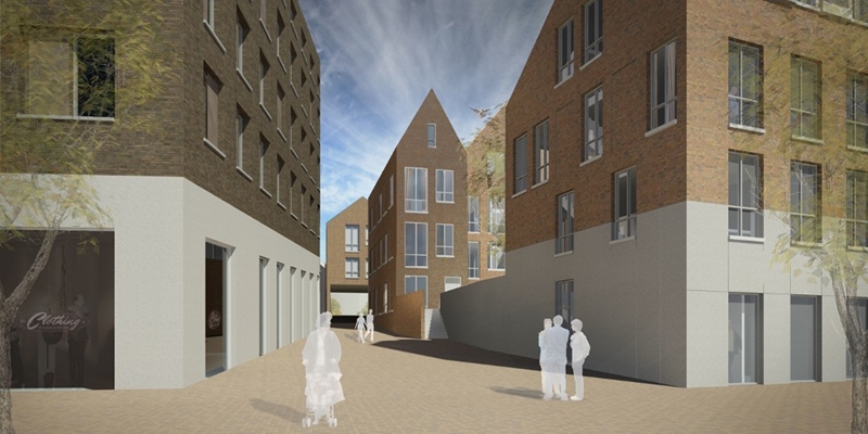 Pal tegenover het stadhuis, op de locatie van het oude winkelcentrum en parkeergarage Thiemsbrug, komt een nieuwe woonwijk, winkels met daarboven appartementen, grondgebonden woningen en bovengronds parkeren.