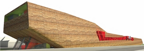 wonnen met een open gebouwvolume, dat is opgebouwd uit 3D-gekromde houten spanten, waartussen een dubbel vlies als huid is gespannen. Deze dubbele huid draagt bij aan de klimaatbeheersing en zorgt met zijn elegante vorm in combinatie met kleurenprojecties voor verrassende effecten in het donker.