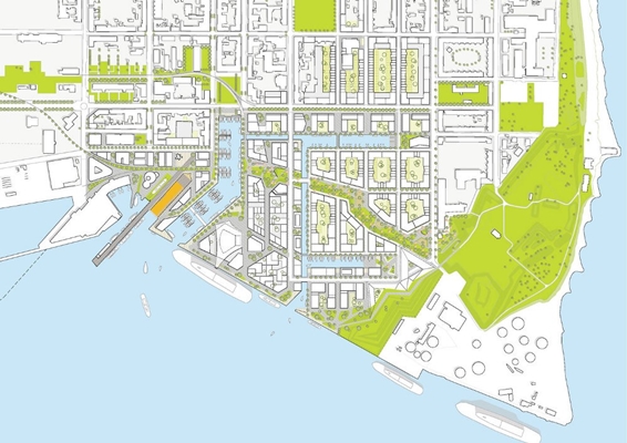 In het plan wordt het renaissance-grid van het stadscentrum doorgezet. Een netwerk van kanalen zorgt voor een overgang naar het water van de haven en versterkt het maritieme karakter van de nieuwe wijk. Het programma in het 21 hectare omvattend gebied behelst 260.000 vierkante meter.