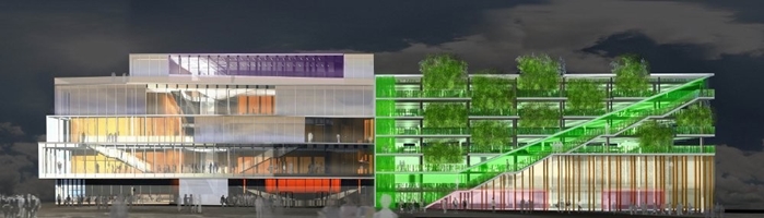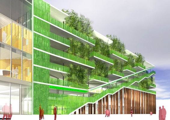 De glazen voor- en achtergevel maakt het gebouw volgens de Architekten Cie. transparant voor de bezoekers van het aangrenzende stadsplein. Op de voorgevel worden ‘groene’ balkons gerealiseerd waarop bamboe planten worden geplaatst.