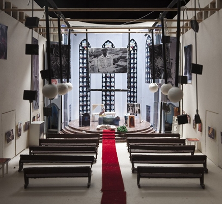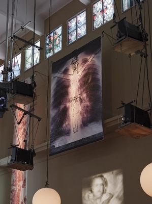 In het paviljoen, oorspronkelijk een kerk, is het decor voor het oratorium ‘Eine Kirche der Angst vor dem Fremden in mir’ van toneelregisseur en filmmaker