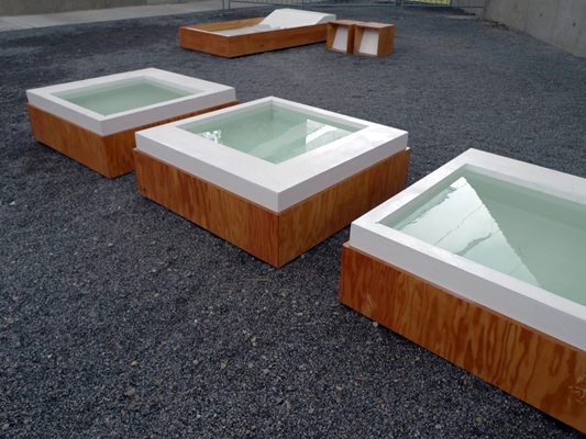 De objecten op het terrein bestaan onder andere uit strobalen die de plantenbakken ‘omlijsten’ en gerecycled hout dat gebruikt is voor de meubels. Ook zijn er pingpongtafels, een fiets en een voetbaltafel beschikbaar gesteld.
