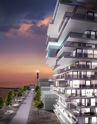 Het ontwerp van de woontoren op de hoek van de Hendrik Baelskaai en de Fortstraat is gebaseerd op het idee dat alle appartementen een buitenruimte moeten hebben van tenminste twintig vierkante meter. De uitkraging van de balkons op verschillende verdiepingen maakt dat het gebouw een dynamisch uiterlijk krijgt. De woontoren krijgt een frisse uitstraling door het gebruik van wit beton.