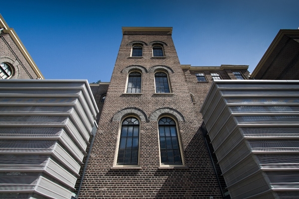 De uitbreidingen zijn aan de achterzijde van het gebouw gemarkeerd met geperforeerde aluminium gevelbekleding, die zorgen voor zonwering en de gewenste anonimiteit van de ruimten.