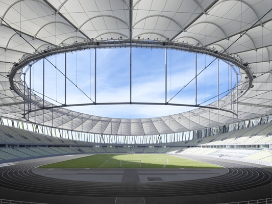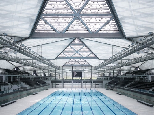 Laatstgenoemde complex bestaat uit een stadion, een sporthal en zwembad. De drie gebouwen zijn gegroepeerd rond een kunstmatig meer en hebben een glazen dak- en gevelconstructie die met name in verlichte toestand een fraai beeld geeft. Met hun kristalachtige uiterlijk gaan de bouwwerken een dialoog aan met het golvende omliggende landschap, verklaart gmp de ontwerpgedachte.