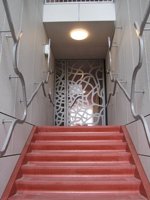 De metalen stroken in het project moeten de takken van de plant voorstellen die langs de entree als trapleuning omhoog ‘groeit’. De brievenbussen hebben ieder een verschillende kleur groen en representeren de blaadjes van de plant. De entreedeur is volledig begroeit met stalen takken.