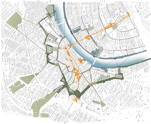 “Binnen een helder framework van groene verkeersring, groene rivier en groene ringen in Kleinbasel worden de verschillende sferen in de stad expressief gemaakt. De ring die binnen en buiten organiseert, waar parkeren aan gekoppeld is en die groen binnen en buiten het centrum aaneenrijgt, is het verdeelpunt. Hier is de inzet om de koppeling tussen stations en centrum te verbeteren.”