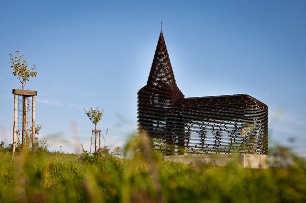 heeft een doorkijkkerk ontworpen voor het landschap van Borgloon in België. De kerk is tien meter hoog en bestaat uit honderd op elkaar gestapelde lagen stalen platen.