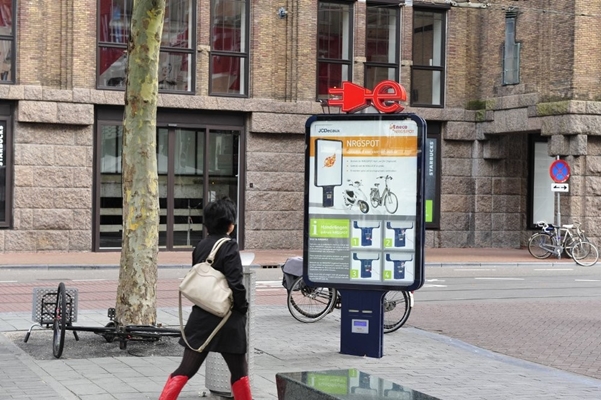 Het Rembrandtplein in Amsterdam is de locatie van de eerste informatiezuil met oplaadpunt voor elektrische fietsen, brommers en scooters. Dit meldde billboardfabrikant