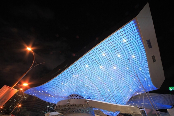 De focus van het hoofdgebouw ligt op de bioscoopzalen in het midden van de plattegrond. De overige functies, zoals kantoren, kleedkamers en een restaurant, zijn rondom de bioscoopzalen gesitueerd. Het geheel, inclusief een openluchtbioscoop met vierduizend zitplaatsen en een plein wordt overdekt door een 85 meter lang dak. "De constructie van een kolomvrij dak geeft de illusie van een 'vliegend' dak het beste weer", vertelt architect Wolf D. Prix.