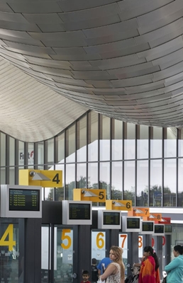 Het stationsgebouw kent twee verdiepingen waar onder andere een café, een wachtruimte, toiletten en ticket- en informatiecentrum zijn gesitueerd. Het pand heeft een glazen voorgevel en een golvend dak. Het dak is bekleed met platen van aluminium en overdekt de perrons. Bblur architecture liet zich voor het ontwerp van het dak inspireren door de ontdekking van infrarode golven door William Herschel in 1800.