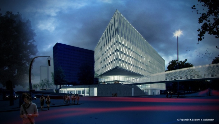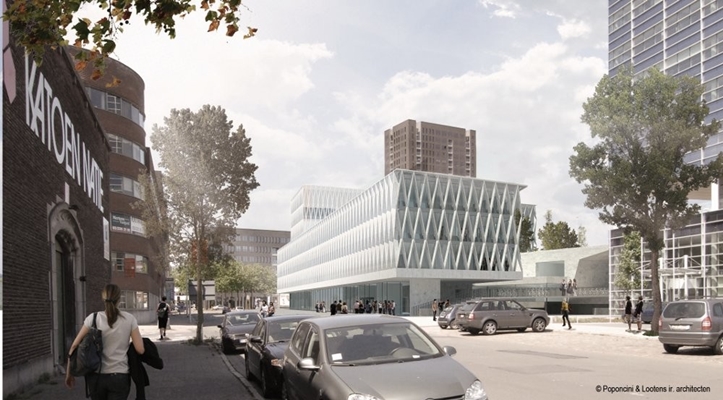 . De nieuwbouw is opgebouwd uit een trapeziumvormige hoofdbouw, een rechthoekige bouw, een langgerekte laagbouw en een binnenplaats met auditoria, een groene zone en een helling naar de uitgestrekte ondergrondse parking.