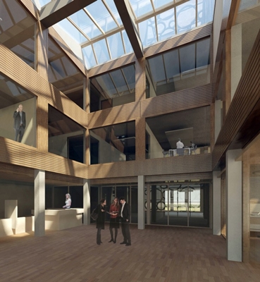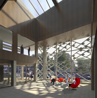 De publieksruimte bestaat uit een atrium, waar het binnenklimaat op natuurlijke wijze is georganiseerd. In het glazen dak zijn fotovoltaïsche cellen zijn opgenomen die tevens als zonwering functioneren.