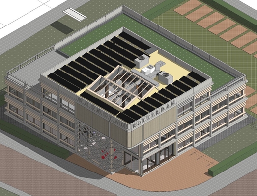 Qua ontwerp sluit het duurzame gebouw volledig aan op de bebouwing van de directe omgeving. Het kantoor bestaat uit een geprefabriceerde betonnen skelet waarin betonkernactivering is opgenomen.