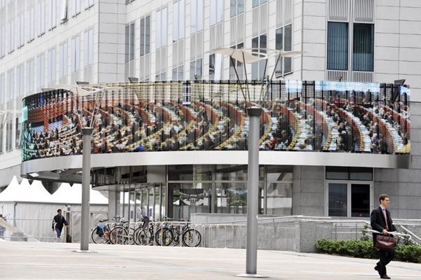 Eén van de installaties is een ‘vergaderzaal’ waar rondom een enorm scherm geplaatst is. Op het scherm wordt de vergaderzaal van het Europees Parlement afgebeeld.