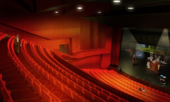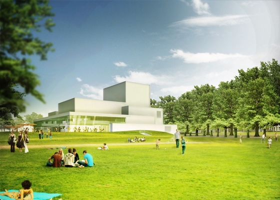 voor de gecombineerde opgave eind 2009. De glooiingen van het park worden doorgezet in de stapeling van de volumes waaruit het theater is opgebouwd. Andersom opent de foyer van het theater zich richting het park en de stad. Dat kan in de zomer ook letterlijk, door de gevel open te schuiven.