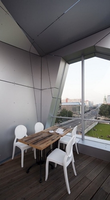 Het exterieur van de Humboldt Box is gevormd door een stalen skelet dat bedekt is met platen van zilver of blauw gewapend beton. De platen in de voorgevel lopen schuin af richting een enorm vierkant raam. Dit raam biedt de voorbijganger vanaf de straat zicht op de derde, vierde en vijfde verdieping. Boven het raamblok is een terras gesitueerd vanwaar het Altes Museum en zijn enorme tuin ten noorden van het centrum te zien zijn.