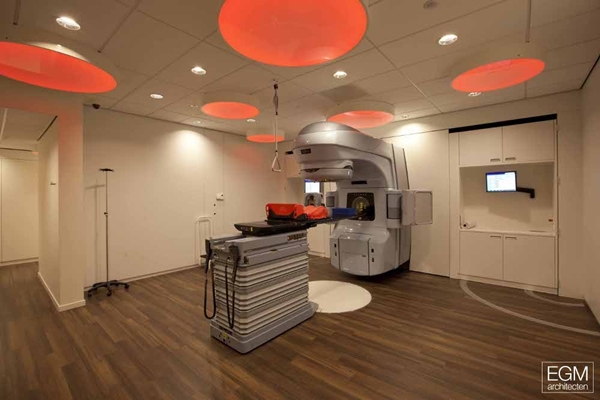 Het golvende dak verbindt de wachtgebieden, biedt intimiteit en opent het interieur naar het groen. De bestralingsbunkers vormen het hart van het gebouw. “Deze zijn niet weggestopt, maar duidelijk zichtbaar als een monolithisch blok. Zij vormen immers het deel van de behandeling dat kans biedt op genezing”, zegt EGM.